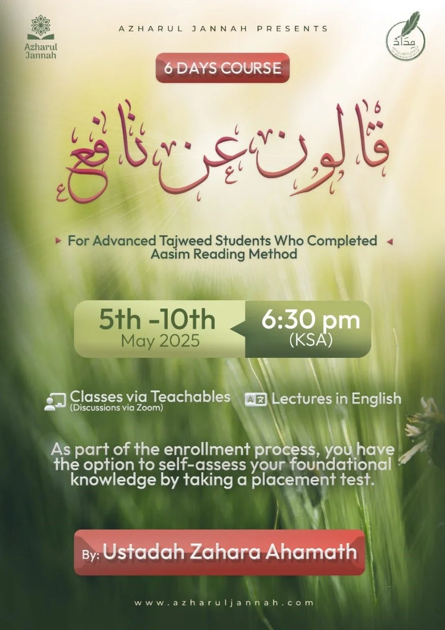 Azharul Jannah 10/6/25 Azharul Jannah 10/6/25 ART-Arabic To Tajweed Read More Reey Al Quloob 10/4/25 Reey Al Quloob 10/4/25 Open Maqra 2025 Read More Tiara Muhammad 9/21/25 Tiara Muhammad 9/21/25 Qira’at-Midad: Abu Jafar Read More Reey Al Quloob 9/21/25 Reey Al Quloob 9/21/25 Reeyul Quloob: Nada ul Quloob Read More Reey Al Quloob 9/14/25 Reey Al Quloob 9/14/25 Recite and Ascend Read More Reey Al Quloob 9/11/25 Reey Al Quloob 9/11/25 Hadith Jibreel Read More Reey Al Quloob 8/26/25 Reey Al Quloob 8/26/25 Giraas Nada for Kids level 01 Read More Reey Al Quloob 8/12/25 Reey Al Quloob 8/12/25 ART - Student Materials Read More Reey Al Quloob 7/15/25 Reey Al Quloob 7/15/25 Qira’at-Midad: Ibn Kathir Read More Azharul Jannah 5/15/25 Azharul Jannah 5/15/25 2-Day Workshop: Tafkheem & Tarqeeq in Shatabiyyah Read More Azharul Jannah 5/9/25 Azharul Jannah 5/9/25 The Light of Salah Read More Reey Al Quloob 5/9/25 Reey Al Quloob 5/9/25 Quranic Voyage Read More Reey Al Quloob 4/6/25 Reey Al Quloob 4/6/25 Qira’at-Midad: Al-Basriyayn Read More Tiara Muhammad 4/4/25 Tiara Muhammad 4/4/25 Qaaidah Nooraniyah 2025 Read More Azharul Jannah 4/4/25 Azharul Jannah 4/4/25 Juzz Amma Memorization Program for Kids Read More Azharul Jannah 4/4/25 Azharul Jannah 4/4/25 Qira’at-Midad: Ashab ut Tawassut Read More Reey Al Quloob 4/4/25 Reey Al Quloob 4/4/25 Qira’at-Midad: Shuba Read More Reey Al Quloob 4/1/25 Reey Al Quloob 4/1/25 Qira’at-Midad: Qalun Read More Reey Al Quloob 3/19/25 Reey Al Quloob 3/19/25 Muqaddimah al-Jazariyyah (Intensive course) Read More Reey Al Quloob 3/19/25 Reey Al Quloob 3/19/25 Reeyul Quloob: Gaythul Quloob Read More Older Posts