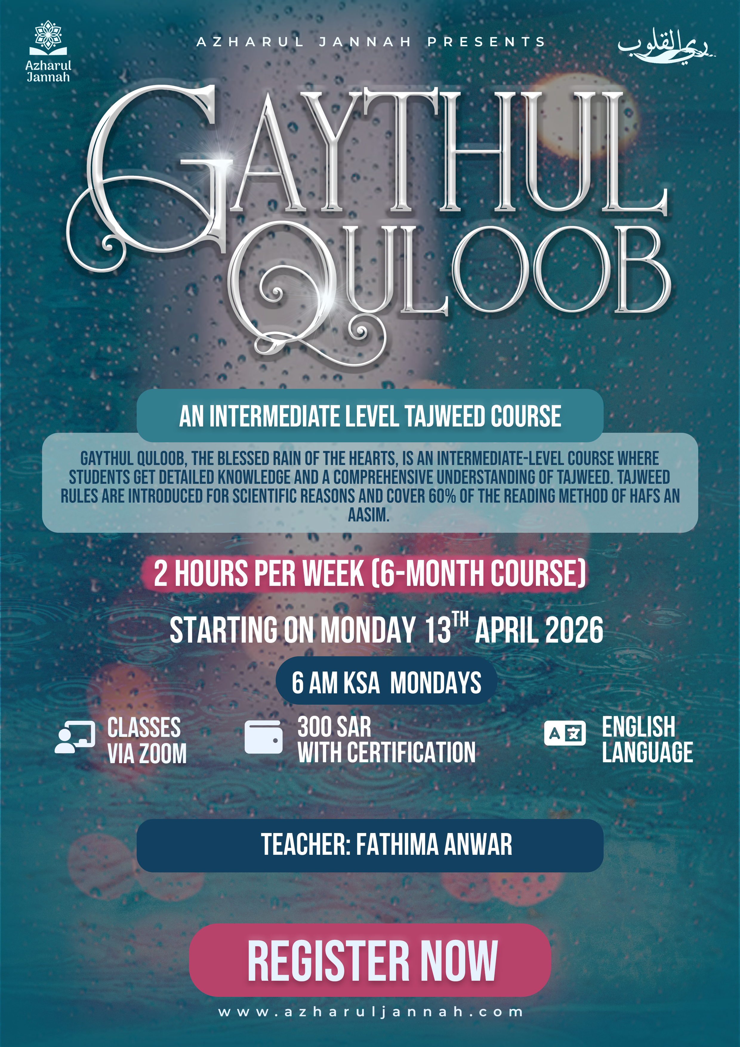 Ghaith ul Quloob, the Blessed Rain of the Hearts, is an intermediate-level course where students get detailed knowledge and a comprehensive understanding of Tajweed. Tajweed rules are introduced for scientific reasons and cover 60% of the reading method of Hafs An Aasim.