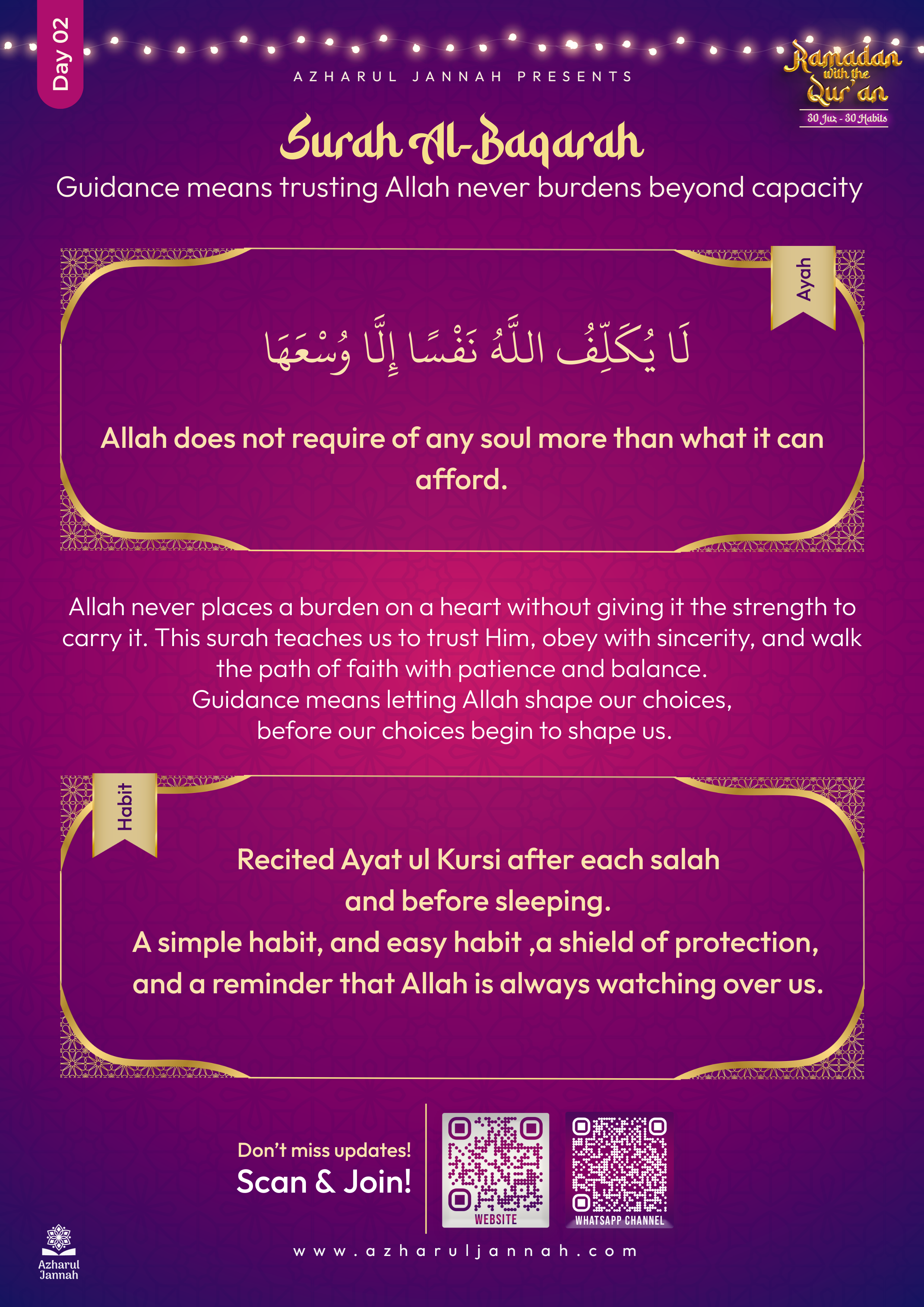 Allah never places a burden on a heart without giving it the strength to carry it. This surah teaches us to trust Him, obey with sincerity, and walk the path of faith with patience and balance.